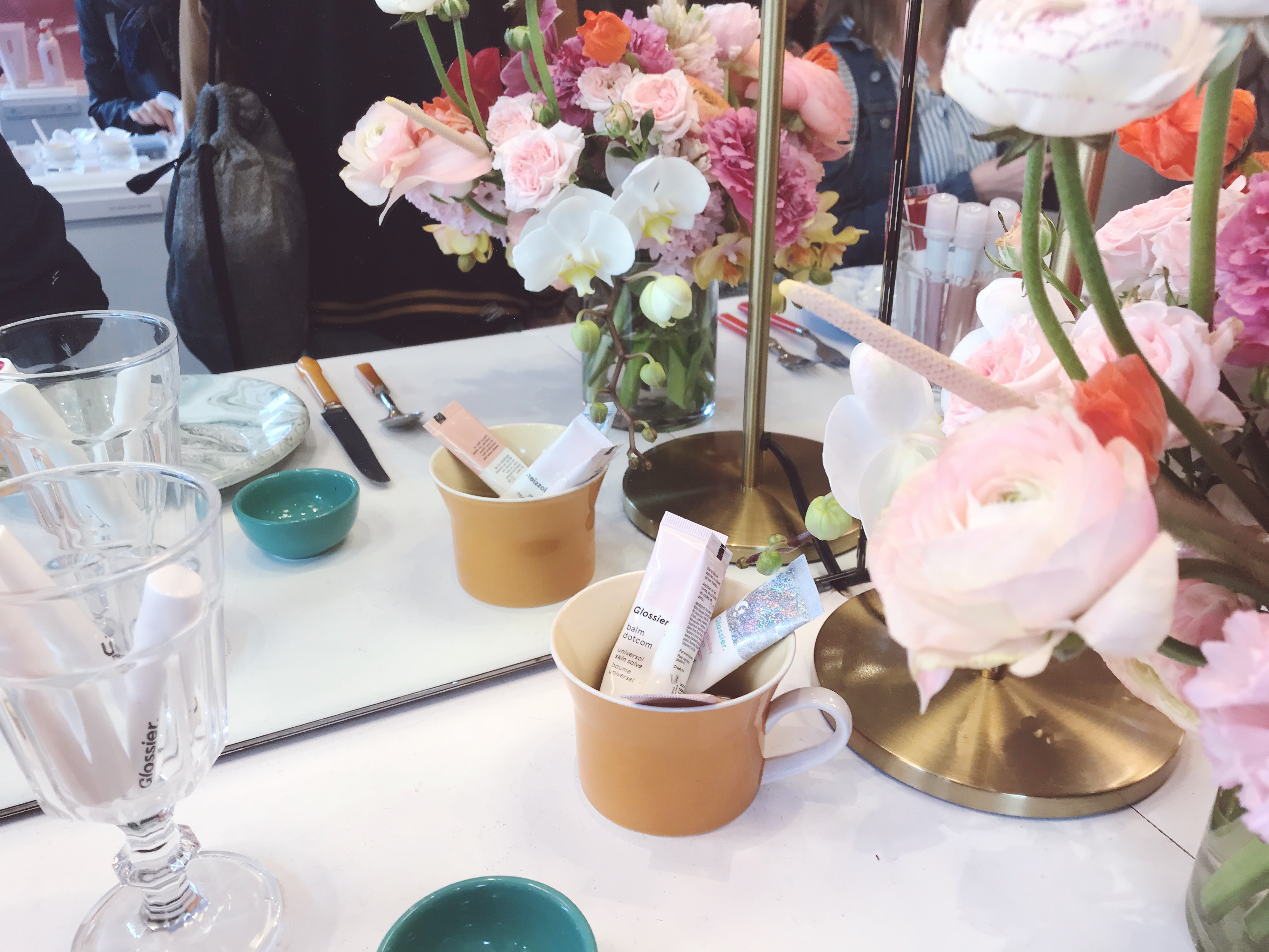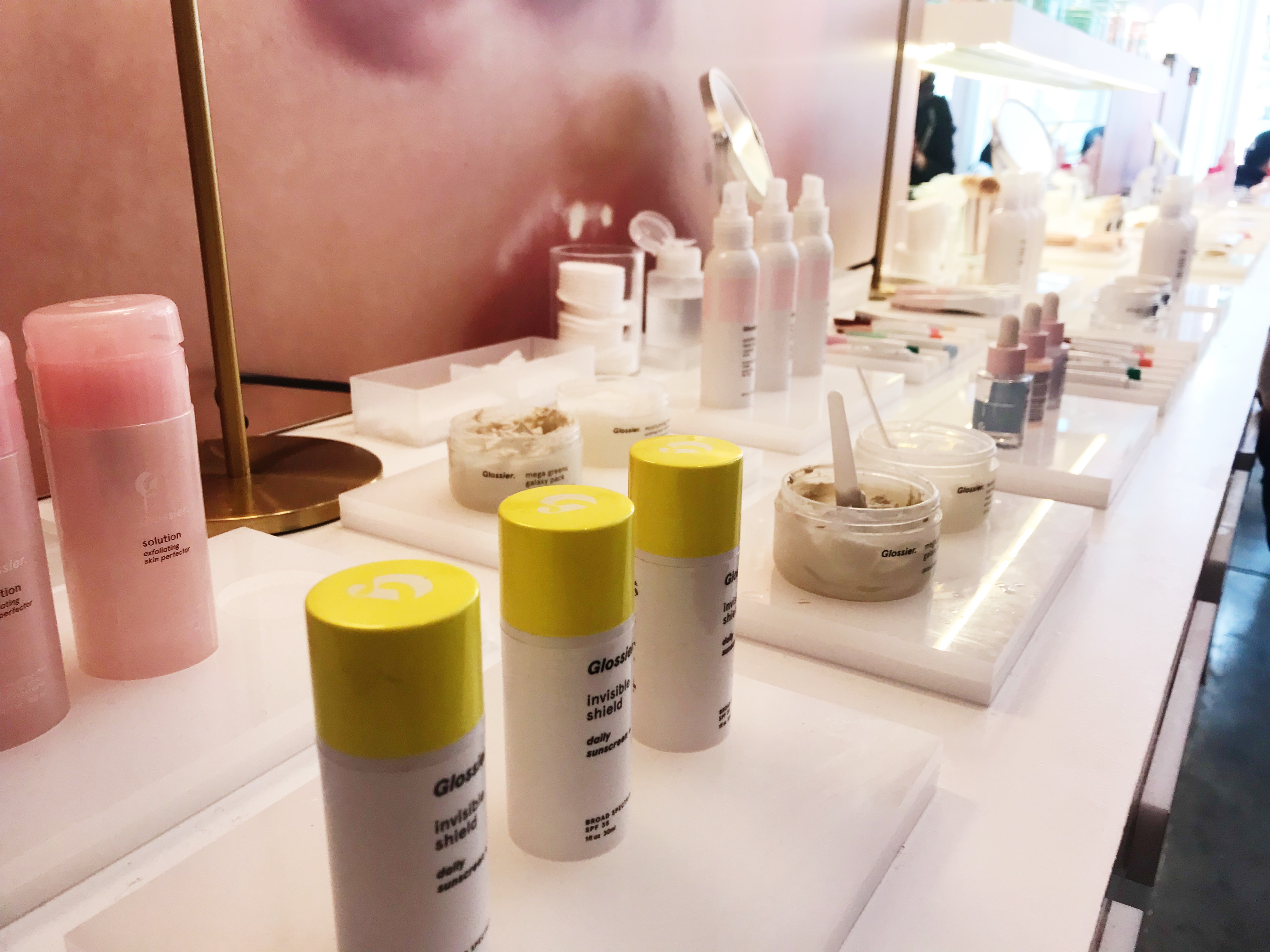 Lo primero que ves es una barra de restaurante que fue acoplada como tocadores, con unos espejos divinos y todos los productos de Glossier expuestos para que las clientas puedan probarlos y jugar con ellos. Desde el icónico Balm DotCom hasta lo más nuevo como los LidStar.